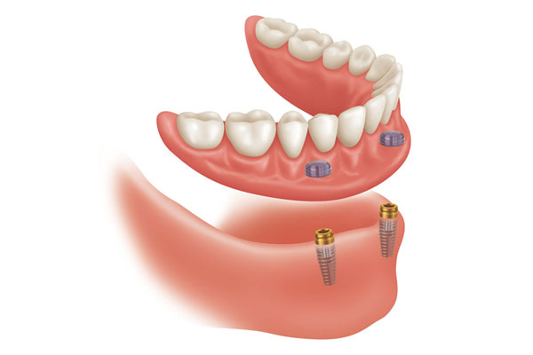 Removable implant retained dentures require fewer implants; Four dental implants securely hold an upper denture allowing the size of the plate to be reduced or eliminated from the denture altogether. Plate reduction or elimination feels more natural and allows for the better tasting of food. Just two implants under a lower denture can improve stability and restore chewing efficiency up to 90% of normal. Four implants provide up to 100% normal chewing efficiency. Removable dentures also allow for easier maintenance and cleaning.